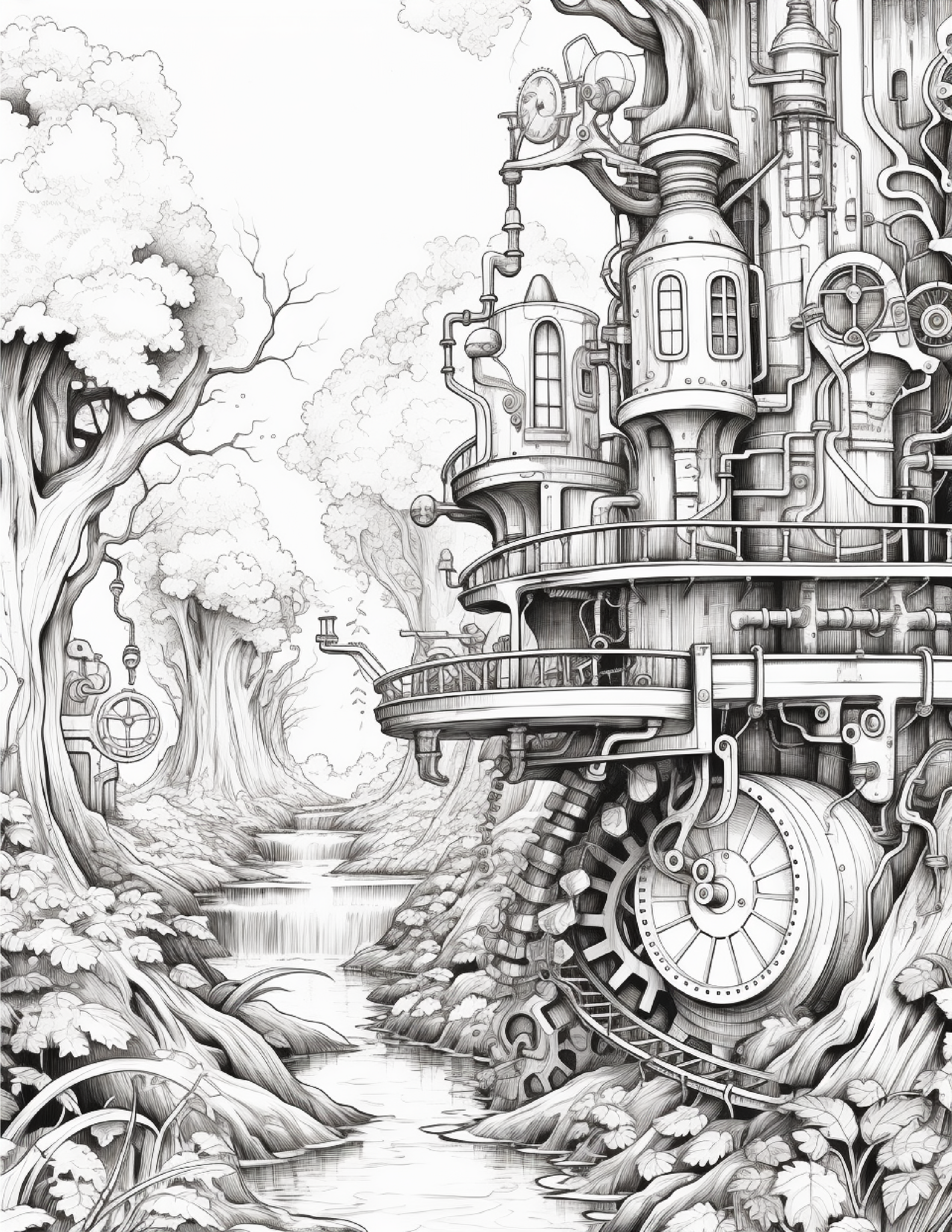 Step into a world where nature meets invention with this extraordinary collection of 220 Steampunk Forest colouring pages. Each page blends the beauty of enchanted woodlands with the creativity of gears, cogs, and intricate steampunk designs.